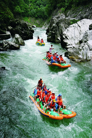 猛洞河水量豐富,河流坡降大,水急灘多浪奇,高大的峭壁直插水面,兩岸并相靠攏,形成幽深的峽谷景觀。沿河兩岸古木蒼天,蒼翠欲滴,奇石錯落,流泉飛瀑隨處可見,下游一路水碧山青,風(fēng)光秀麗,野猴成群,溶洞奇特。猛洞河天下第一漂項(xiàng)目位于猛洞河支流,全長47公里,最精彩處位于哈妮宮至牛路河段,長約17公里。該景區(qū)兩岸多為原始次森林,蔥蔥郁郁,水流湍急,碧綠清亮,有十里絕壁,十里瀑泉,十里畫卷,十里洞天的美譽(yù)。其中有急流險(xiǎn)灘108處,大小瀑布20處。漂流,穿急流,越險(xiǎn)灘,闖狹谷,捕激浪,有驚無險(xiǎn),回味無窮。特別是哈妮宮、三角巖、雞籠門、遇仙峽(捏土)、閻王灘、落水坑、夢思峽、鯉魚剖肚、三大炮等景點(diǎn),無不令人叫絕觀止。