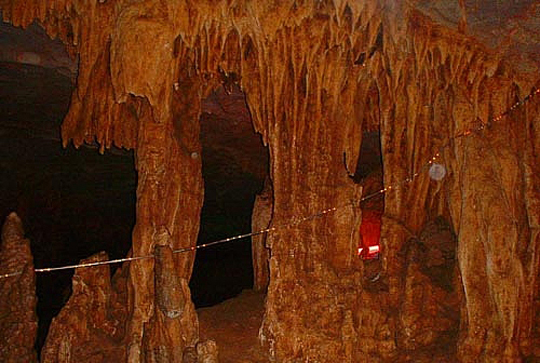| 藏君洞為一大型天然溶洞,溶洞長25000米,已探明洞長4000m,洞內(nèi)洞中有洞、洞中有河,迂回曲折,地下河流水潺潺,溶洞分布在石炭系中、上統(tǒng)碳酸鹽巖中,洞內(nèi)鐘乳石十分豐富:石筍、石柱、石幔、石樓、石像比比皆是。洞內(nèi)構(gòu)造奇特,石鐘乳千姿百態(tài)、絢麗多彩,景觀奇秀,珍品奇絕,是我國少有的大型碳酸鹽巖巖溶洞穴之一。目前已開發(fā)的4000m洞穴中,由十二個大的溶洞群構(gòu)成,由洞口往里有護(hù)君堂、惠帝殿、兩重天、南巡廳、不夜城、龍鳳宮、北國廳、江南廳、江河壩、閱兵場、國寶廳等溶洞景觀區(qū)。溶洞一般高5~30m,長60~100m,寬10~20m,面積60~200㎡。十二個溶洞沿地下河呈串球狀分布,洞與洞之間有巷道(地下河管道)相連,溶洞中景觀十分豐富,仿佛是一個瑰麗的地下宮殿。如護(hù)君堂內(nèi)有“尚書帽”、“御馬”、“貓頭鷹”、“小羊羔”、“老夫妻”、“天宮浴盆”等景點,惠帝殿內(nèi)由“斷劍石”、“龍椅”、“觀音立佛”、“觀音蓮花寶座”等,“蔬果長廊”中有形似花菜、白菜、絲瓜、茄子、黃瓜等石筍,不夜城內(nèi)有乳白色石鐘乳巖溶坡面,龍鳳宮內(nèi)有石幔、石柱琳瑯滿目及鐘乳石構(gòu)成的似漢白玉“龍鳳石床”、“旭日東升”的浮雕石鐘乳墻、“燈籠群”、“攀龍柱”、“石蓮花”等,國寶廳巨型石柱等,巷道側(cè)壁唐僧師徒“西天取經(jīng)”壁畫等,景觀類型齊全,是巖溶洞穴中具有典型地學(xué)意義的巖溶地貌景觀,屬國家級的地質(zhì)遺跡景觀。