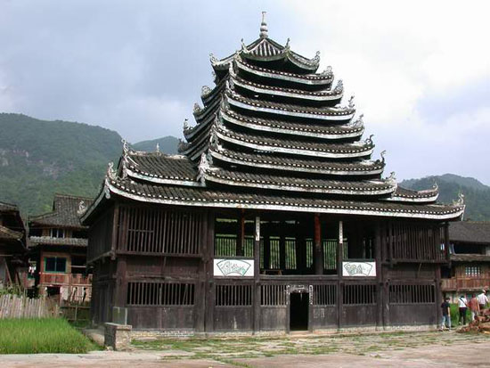 位于通道侗族自治縣坪陽鄉(xiāng)田心寨境內(nèi),始建于清順治年間,為侗族獨特建筑。方形二層樓閣,九層八柱,木結構。邊寬8米,高20米。頂蓋為八角形,上托葫蘆寶頂。封檐板與樓內(nèi)大梁彩繪民間圖畫,各檐翹角飾禽獸浮雕。底層設火塘,四周置木凳。二樓正面系活動板壁,可兼做戲臺。