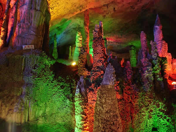 | 九天洞位于湖南張家界市桑植縣城17公里的利福塔鄉(xiāng),距市區(qū)70公里,距武陵源62公里,因洞內(nèi)有九個(gè)自然天窗九天洞而得名,總面積250公頃,是中國(guó)目前發(fā)現(xiàn)的溶洞之最,比號(hào)稱世界第一的利川溶洞大三倍。九天洞內(nèi)空氣清新,冬暖夏凉。整座洞穴分上、中、下三層,有五層不同高度的螺旋式觀景臺(tái),最下層低于地表面400多米。經(jīng)初步探明洞內(nèi)有40個(gè)大廳、3條落差懸殊的陰河、12條瀑布、5座自生橋、10余座洞中山,此外,還有不可勝數(shù)的五光十色的鐘乳石群。在眾多迷人的景觀中尤以九星山、玉宮、水晶宮、九天玄女宮、壽星宮五大奇觀最為著名。