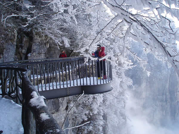 據(jù)施工人員介紹,此條棧道也是他們所修棧道中施工最難,最險峻的一條。如果您還覺得不夠刺激的話,在棧道的完結(jié)處的兩個懸崖之間有一條長160米的懸索吊橋,同時,在海拔最高點還有一個挑戰(zhàn)心里極限的玻璃站臺,在這里,如果你能挺直腰板伸開雙臂,那么,您就是真正的勇士了。