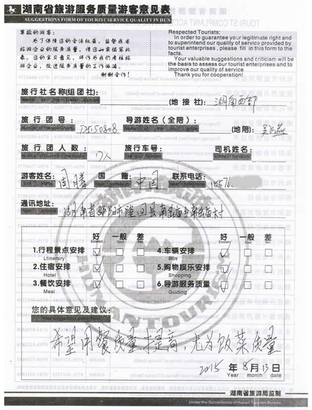 8月初,湖南邵陽(yáng)周先生一行17位貴賓與湖南西部(張家界)中國(guó)國(guó)際旅行社工作人員——小王取得聯(lián)系,經(jīng)過商談,雙方達(dá)成協(xié)議并簽訂旅游合同,于8月9日抵達(dá)張家界,開始張家界之旅。此次行程是由我社優(yōu)秀導(dǎo)游——吳飛燕負(fù)責(zé)旅游接待工作,吳導(dǎo)在旅游過程中講解詳細(xì),客人也很滿意,在意見表上要求我們:希望用餐質(zhì)量提商,尤為飯菜質(zhì)量,我們感謝周先生為我社提出了寶貴意見,謝謝周先生。同時(shí)也感謝周先生選擇湖南西部(張家界)中國(guó)國(guó)際旅行社,以及您對(duì)湖南西部國(guó)旅的信任與支持。我們會(huì)繼續(xù)努力,做好旅游接待工作。期待下一次與您的合作,祝您愉快!