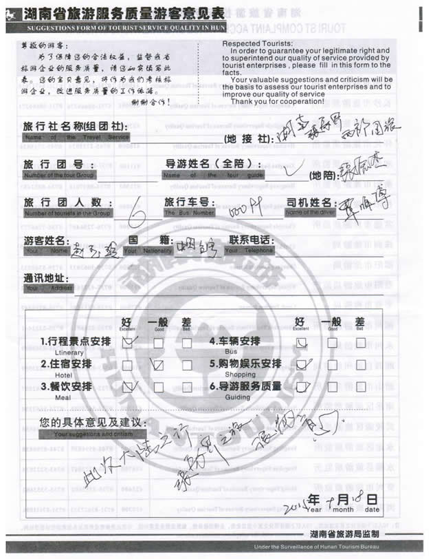 5月份,臺(tái)灣趙女士一行6位貴賓與湖南西部(張家界)中國(guó)國(guó)際旅行社工作人員——小龔取得聯(lián)系,經(jīng)過(guò)商談,雙方達(dá)成協(xié)議并簽訂旅游合同,于9月12日抵達(dá)張家界,開(kāi)始張家界之旅。此次行程是由我社優(yōu)秀導(dǎo)游——張杰負(fù)責(zé)旅游接待工作,張導(dǎo)在旅游過(guò)程中講解詳細(xì),客人也很滿意,在意見(jiàn)表上寫(xiě)道:此次大陸之行、張家界之旅、很滿意。同時(shí)也感謝趙女士一行貴賓選擇湖南西部(張家界)中國(guó)國(guó)際旅行社,以及您對(duì)湖南西部國(guó)旅的信任與支持。我們會(huì)繼續(xù)努力,做好旅游接待工作。期待下一次與您的合作,祝您愉快!