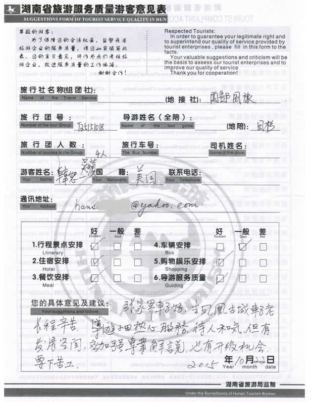 現(xiàn)在位置:首頁 -> 西部國旅->旅游質(zhì)量反饋 -> 2015-10-18 臺(tái)灣韓先生一行4位貴賓 天門山、張家界、天子山、鳳凰古城四日游