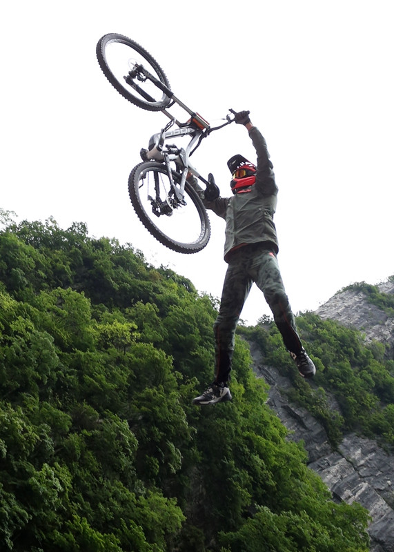 自行車運(yùn)動包含了公路自行車和山地自行車,而山地自行車又包含眾多種類,BMX小輪車,攀爬車, XC(越野山地車),AM(全山地車山地車),DH(山地速降)等。其中,DH屬于山地自行車運(yùn)動中最重型車種,騎行最具挑戰(zhàn)性、觀賞性、技巧性。DH山地速降最典型的賽道是在山上,樹林中,天門山999級臺階速降騎行對于DH山地車速降來說更具挑戰(zhàn)性。整條臺階沒有平坦路面,一路顛簸下山,中途沒有可調(diào)整的機(jī)會,要求車手有極高的控車能力,天梯平均陡度39度以上,僅是站立在臺階上就已經(jīng)感覺一覽眾山小了,站在自行車上更是陡峭,天梯一路筆直下山,加上其坡度,車手的速度可想而知,也更是車手對車子的控制力的一個(gè)新挑戰(zhàn)。賽道中還加設(shè)了跳臺,車手在應(yīng)付如此高難度臺階路段同時(shí),還要進(jìn)行跳躍,更是難上加難。天門山天梯速降賽被業(yè)界譽(yù)為“世界上難度最大,對選手技術(shù)要求最高的速降賽”,其極高的難度和無與倫比的觀賞性成為世界范圍內(nèi)最精彩最具挑戰(zhàn)性的自行車速降比賽之一。