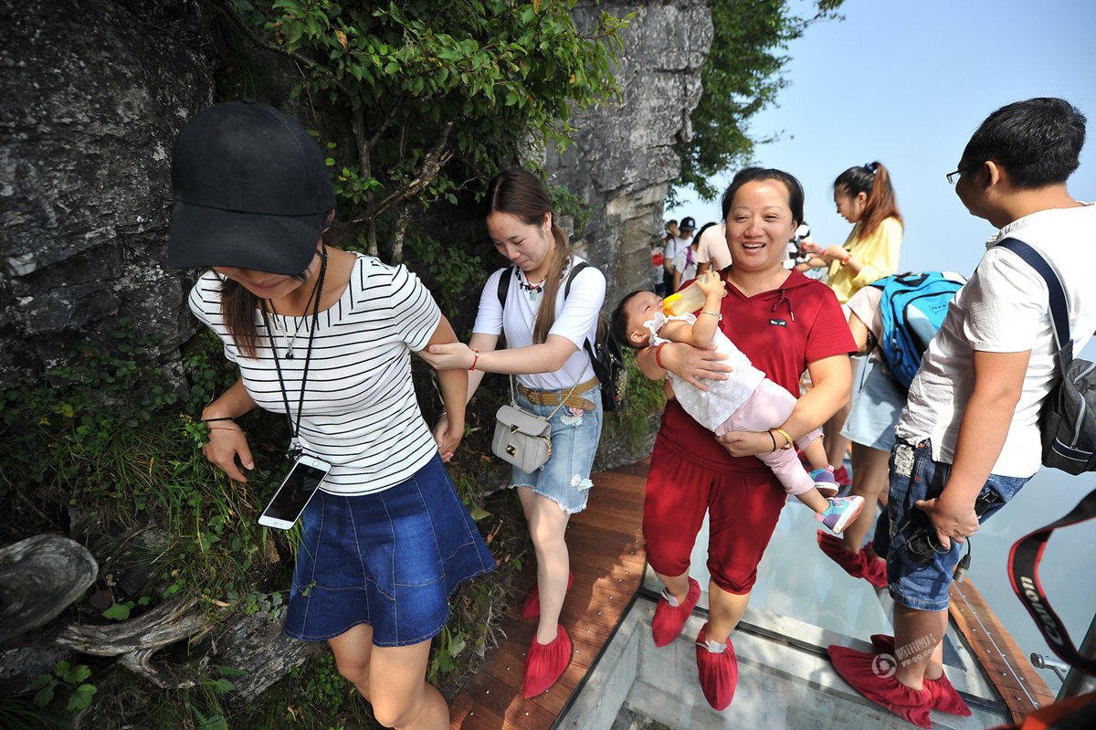 8月1日,天門山景區(qū)第三條玻璃棧道——盤龍崖玻璃棧道開通迎客。玻璃棧道全長(zhǎng)100米、寬1.6米,因站在玻璃棧道上能俯瞰天門山99道彎盤山公路而得名“盤龍崖玻璃棧道”。該玻璃棧道以其絕壁凌空的恢弘氣勢(shì)和令人頭暈?zāi)垦5囊曈X感受備受游客青睞。