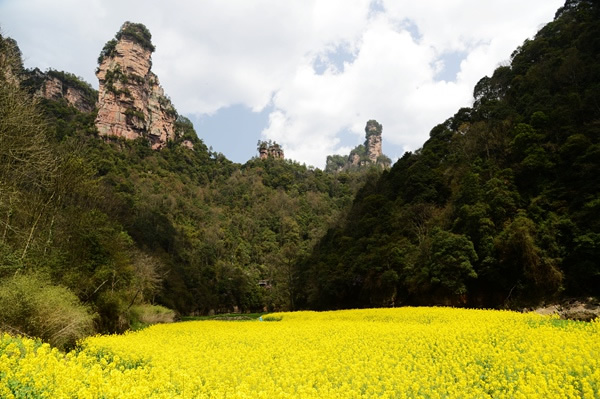 據(jù)了解,這塊“黃金地”位于武陵源十里畫廊景點入口靠近索溪湖尾處,實乃一片沙洲地,景區(qū)居民種植的油菜正是花開季節(jié),猶如黃金灑滿大地。這塊色澤艷麗的“黃金地”,與近處清澈的溪水、嫩綠的水草,以及遠(yuǎn)處發(fā)芽的樹木、翠微的峰林一起,構(gòu)成一幅絕美天然的山水畫,為外界傳遞著武陵源濃濃的春意。