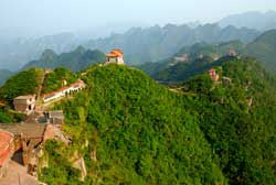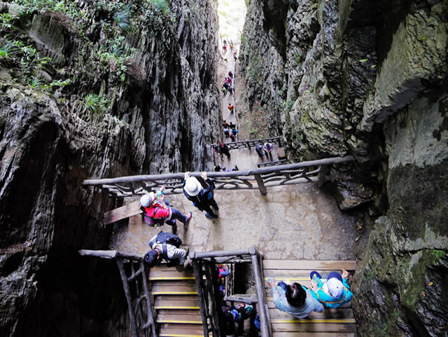 天梯棧道的木板很窄,依次往下延伸,就像一架天梯,把我們送往迷人的仙境。這道“天梯”不是天賜的,而是靠了當(dāng)?shù)氐纳矫瘢道K索,手扶峭壁,肩扛背馱,將這些堅(jiān)硬而沉重的石頭從山頂一塊一塊地運(yùn)來(lái)、鋪好,鋪成現(xiàn)在這條看似險(xiǎn)峻、其實(shí)結(jié)實(shí)安全的1600多級(jí)石階棧道。